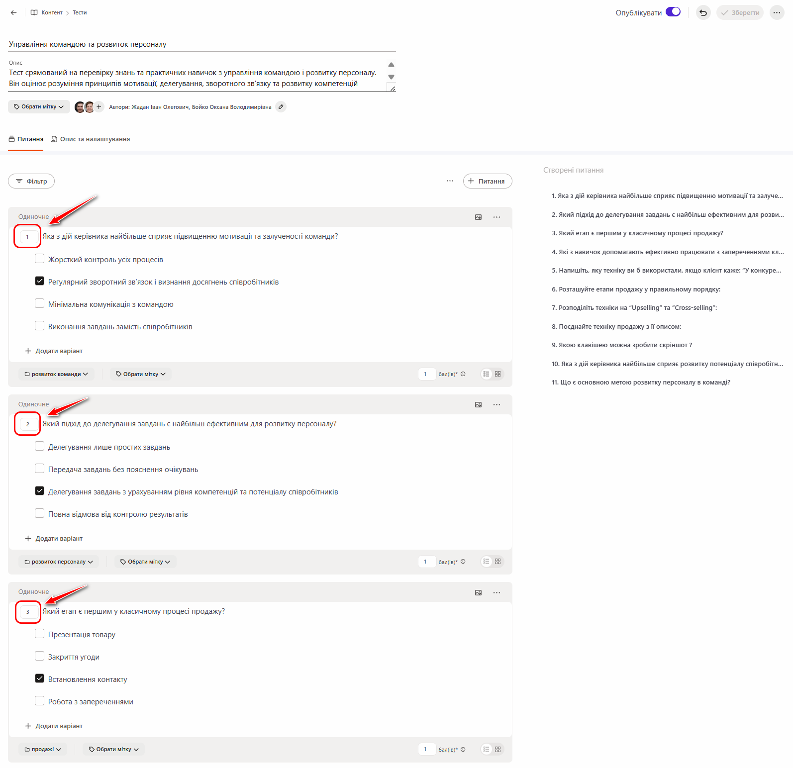 - Змінити порядковий номер питання, нумерація інших питань змінеться автоматично: