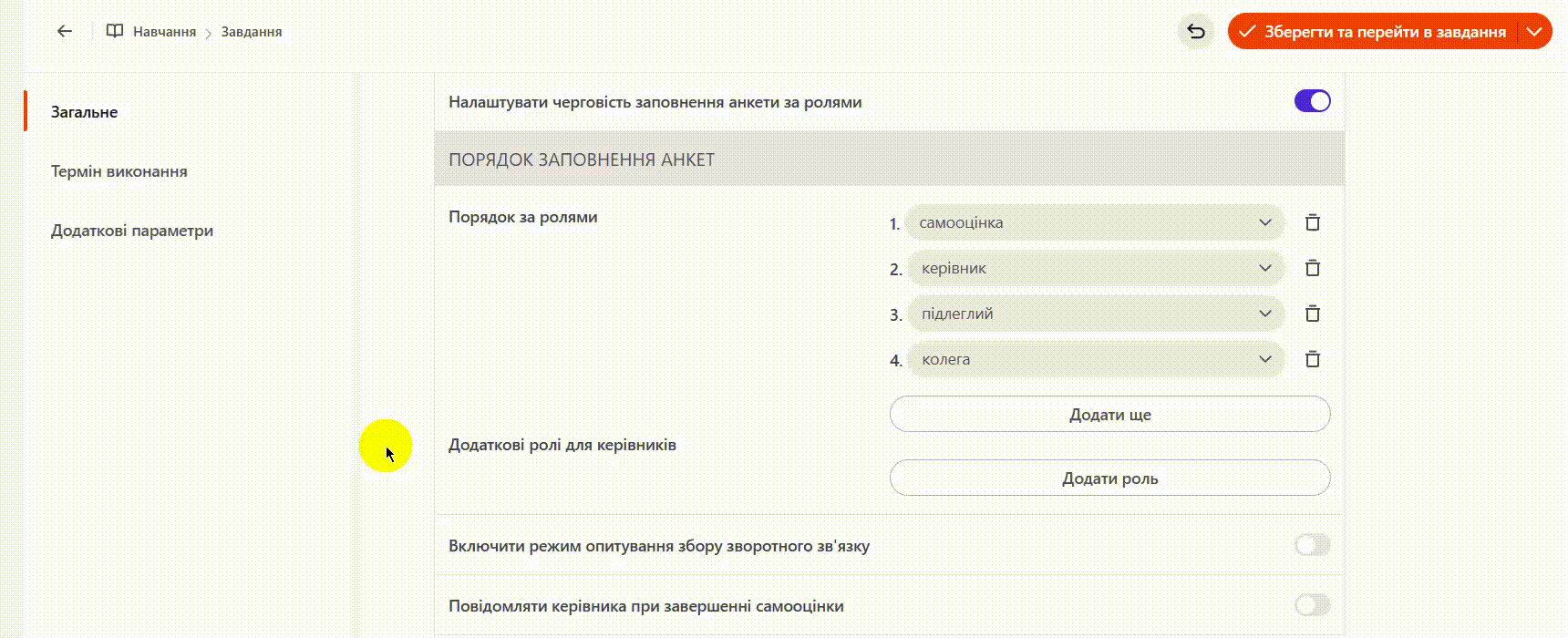 Для визначення черговості оцінювання в полі "Порядок за ролями" навпроти порядкового номера оберіть потрібну роль із випадаючого списку: самооцінка, керівник, підлеглий, колега, співробітник.