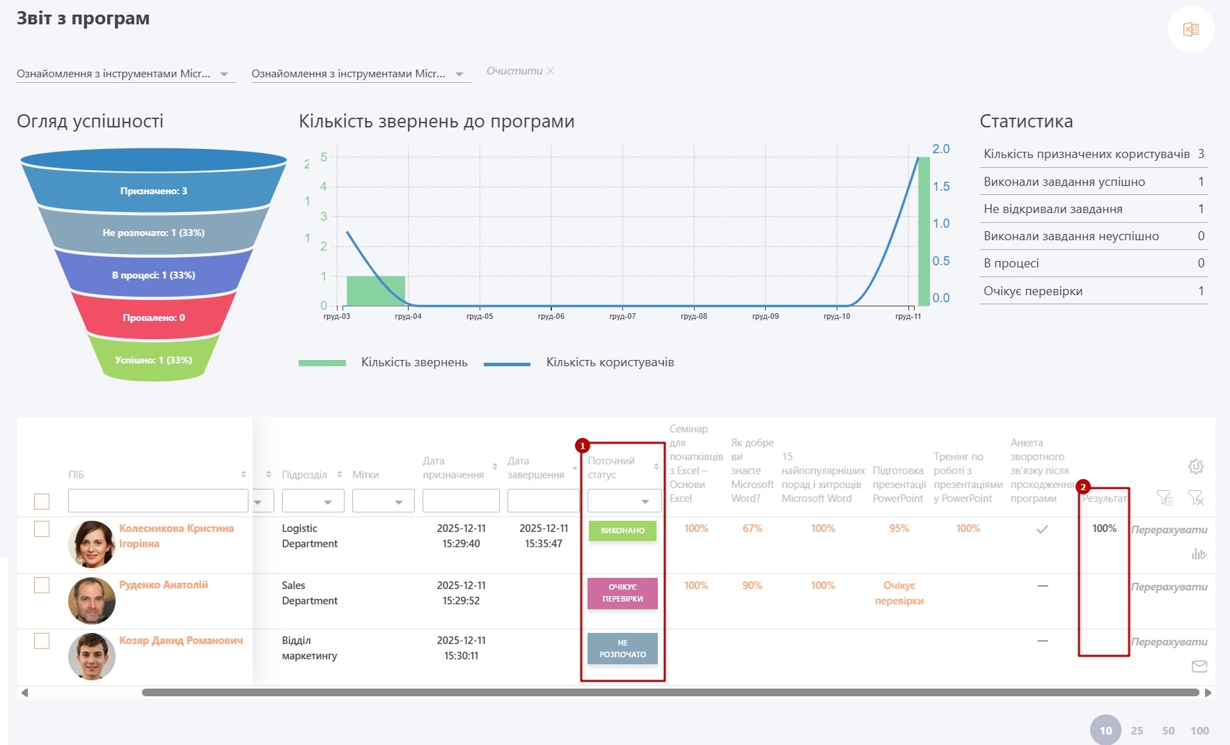 Результат виконання програми (2) - це відсоток успішного виконання елементів програми (тобто кількість успішно виконаних завдань відносно всіх елементів програми). Результат відображається у списку Мої завдання для користувача, на сторінці Історія навчання, в звітах - Звіт по програмам і Зведений звіт для адміністраторів та керівників.