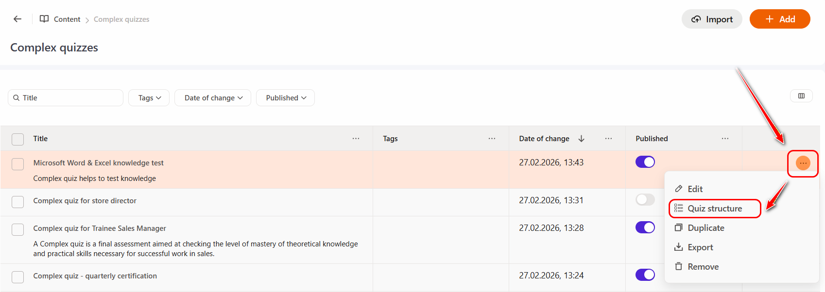 - when editing a Complex quiz - via the Actions button - Quiz structure in the Complex quizzes table