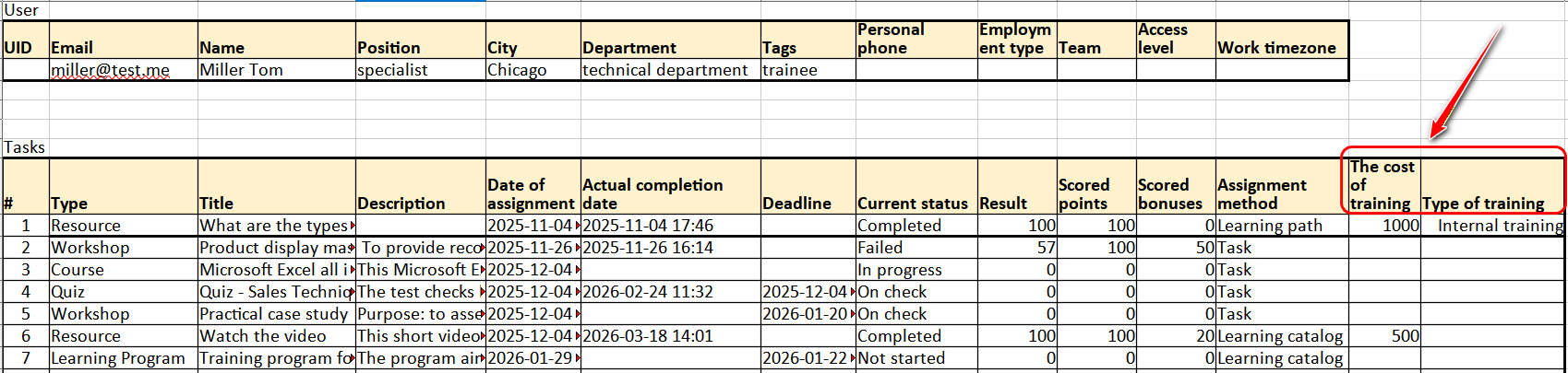 The table displays data on tasks assigned to the User: Name, Type, Date of assignment, Due date, Current status, Result, Scored points. By all these parameters, you can filter the data in the table, as well as sort (alphabetically or in ascending/descending order).