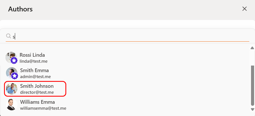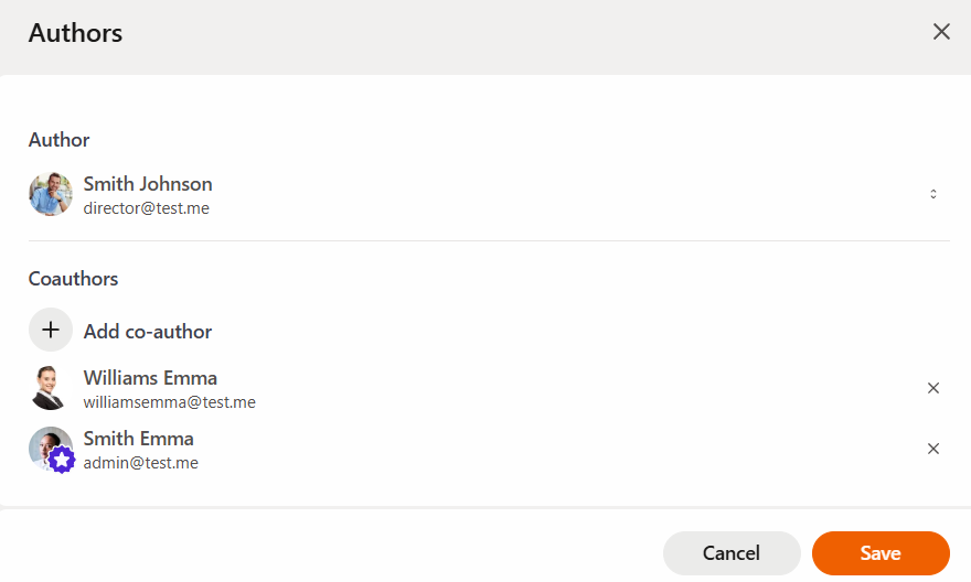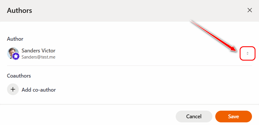 To change the Author or add a Co-author, click the "plus" or "pencil" icon, after which a modal window for the corresponding actions will open.