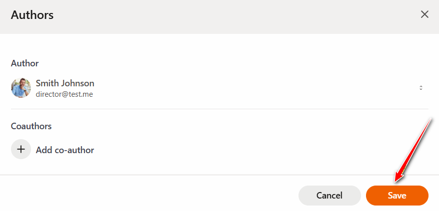 To add a Co-author, click the "Add Co-author" button, select a user from the dropdown list or use the search, and then click "Save".
