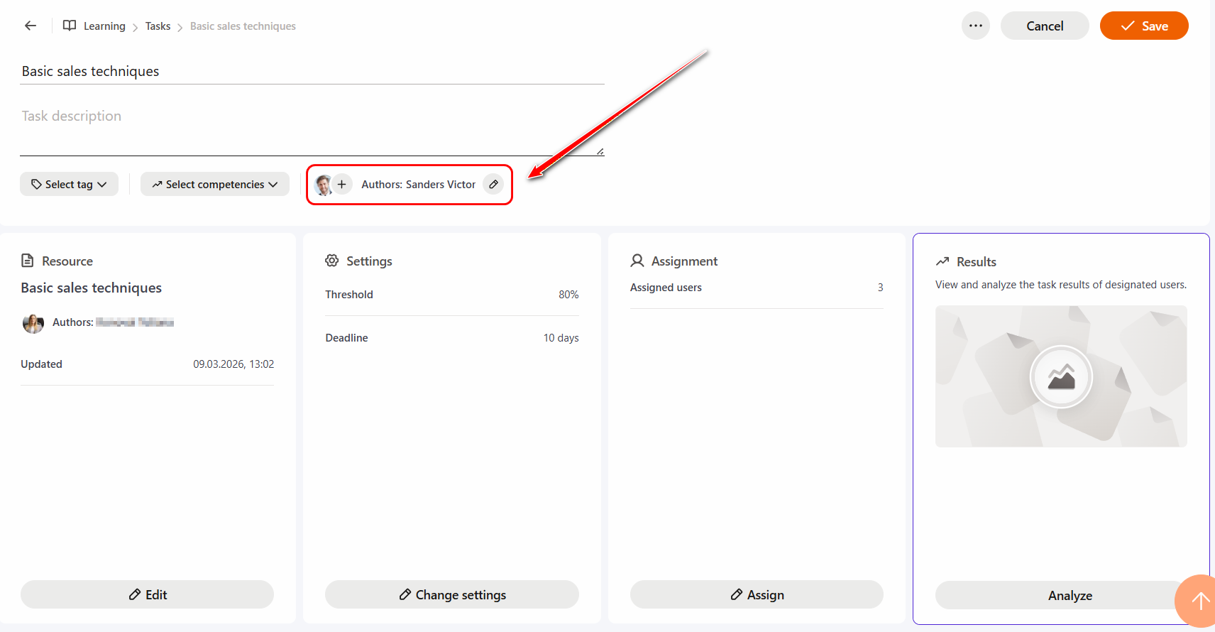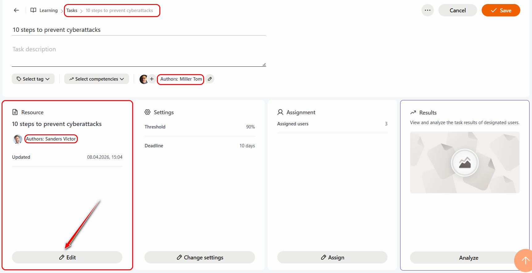 A user assigned as a Co-author of a task can edit the corresponding learning content (resource, test, course, etc.) only if they are the Author or Co-author of that content and have management permissions. If they do not have such permissions, editing will be blocked, and the system will display a corresponding notification.