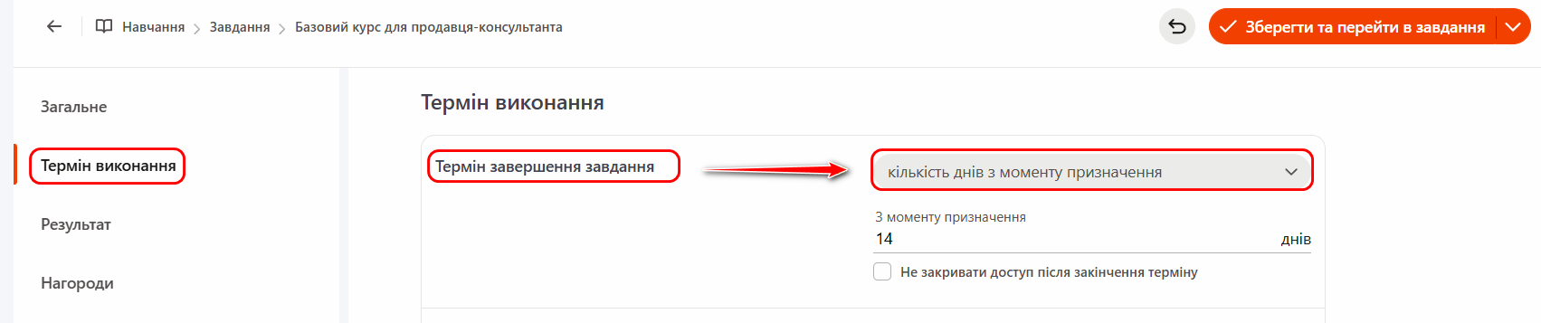 Не закривати доступ після закінчення терміну - якщо опція ввімкнена (проставлено чекбокс), користувачі можуть виконувати завдання після закінчення терміну.