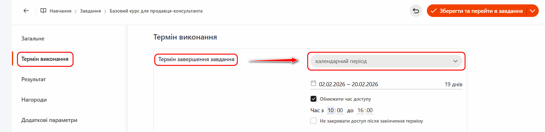 - Календарний період - обмеження на виконання завдання визначається за календарними датами. Також є можливість обмежети час доступу до завдання в межах вказаних годин.
