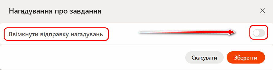 Відкриється модальне вікно Нагадування про завдання, де необхідно включити перемикач Ввімкнути відправку нагадувань: