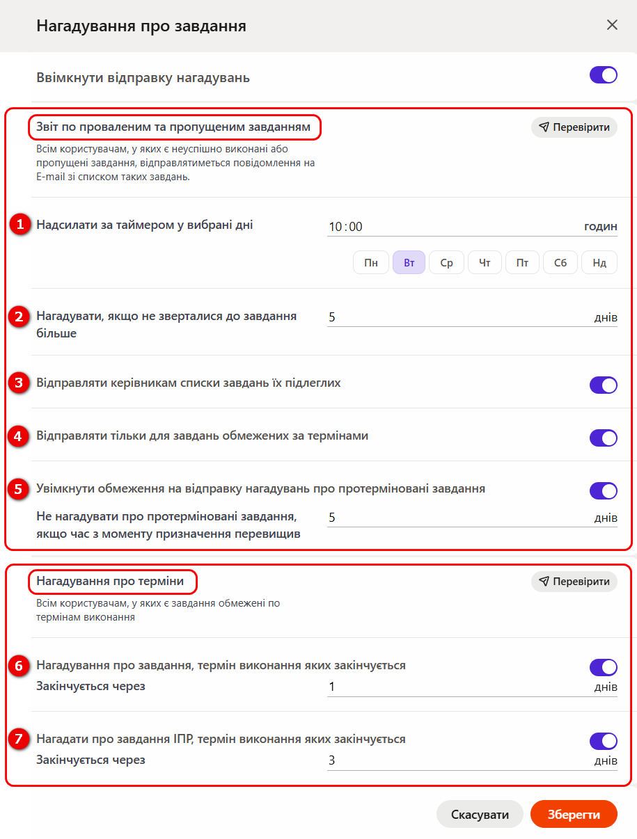 (5) - Увімкнути обмеження на відправку нагадувань про протерміновані завдання - ввімкнувши дану опцію можна виставити кількість днів, після закінчення яких не буде відправлятися нагадування про прострочені завдання. Відлік починається після закінчення терміну проходження завдання. Мінімальне значення – 1 день.