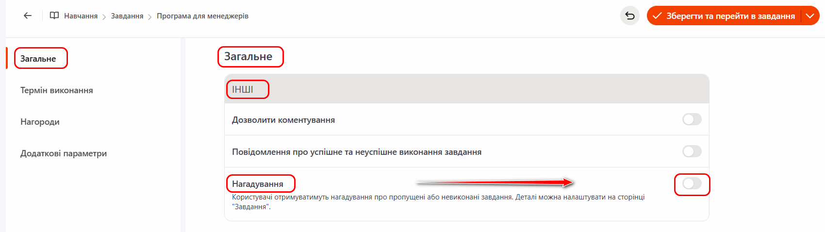 Нагадування про завдання - налаштування для відправки автоматичних нагадувань про завдання для користувачів. Це додаткові нагадування, які можна увімкнути або вимкнути в налаштуваннях завдань. Залежно від обраних налаштувань користувачам надсилатимуться різні типи повідомлень: