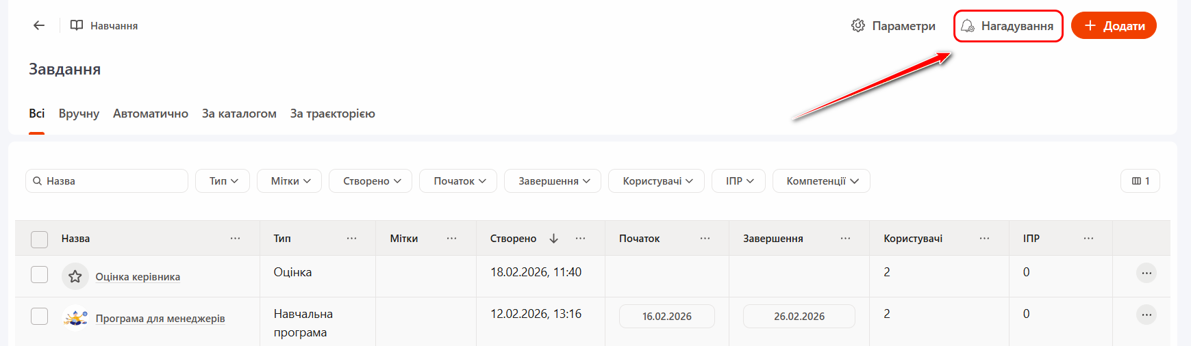 Щоб перейти до налаштувань потрібно в Таблиці з завданнями (меню Навчання - Завдання) натиснути на кнопку Нагадування: