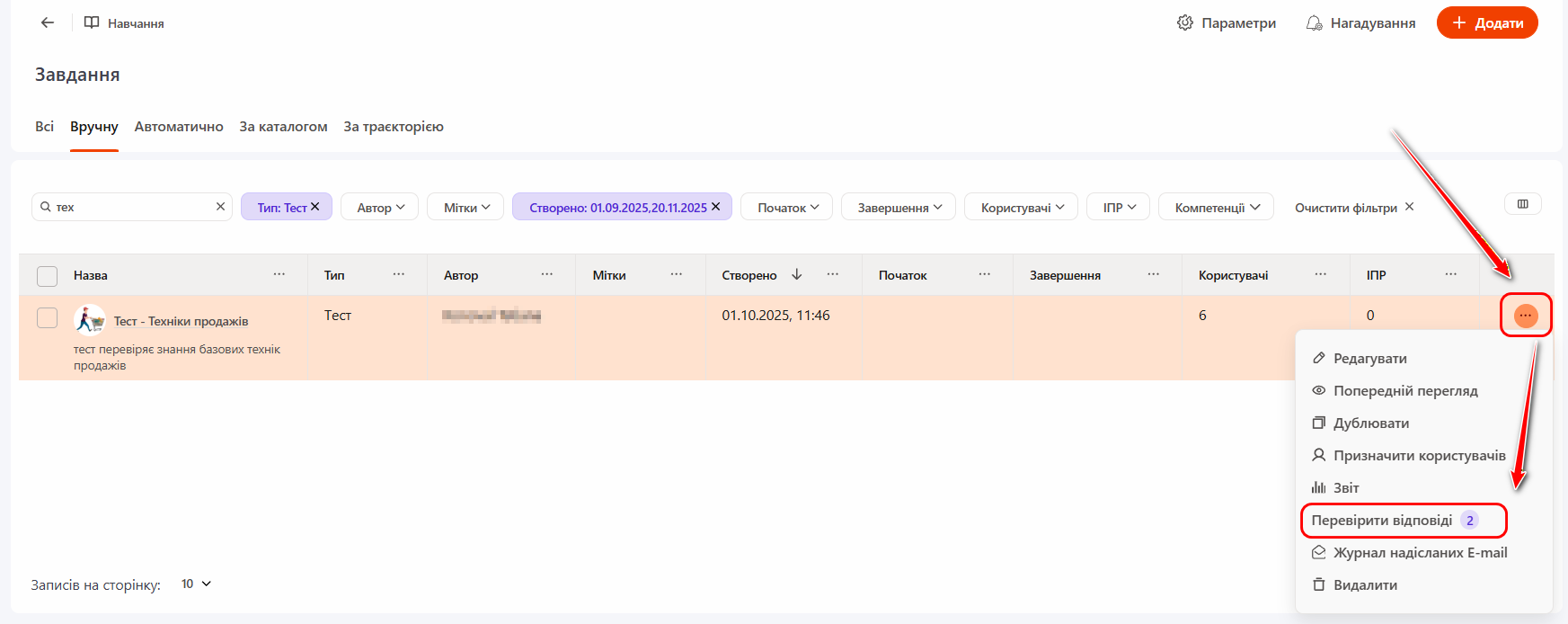 Якщо в складі завдання (типу тест, курс, програма або комплексний тест) є питання з вільною відповіддю, які потребують перевірки, у меню кнопки Дія (13) з’явиться пункт "Перевірити відповіді" для переходу на сторінку Відповіді на перевірку.