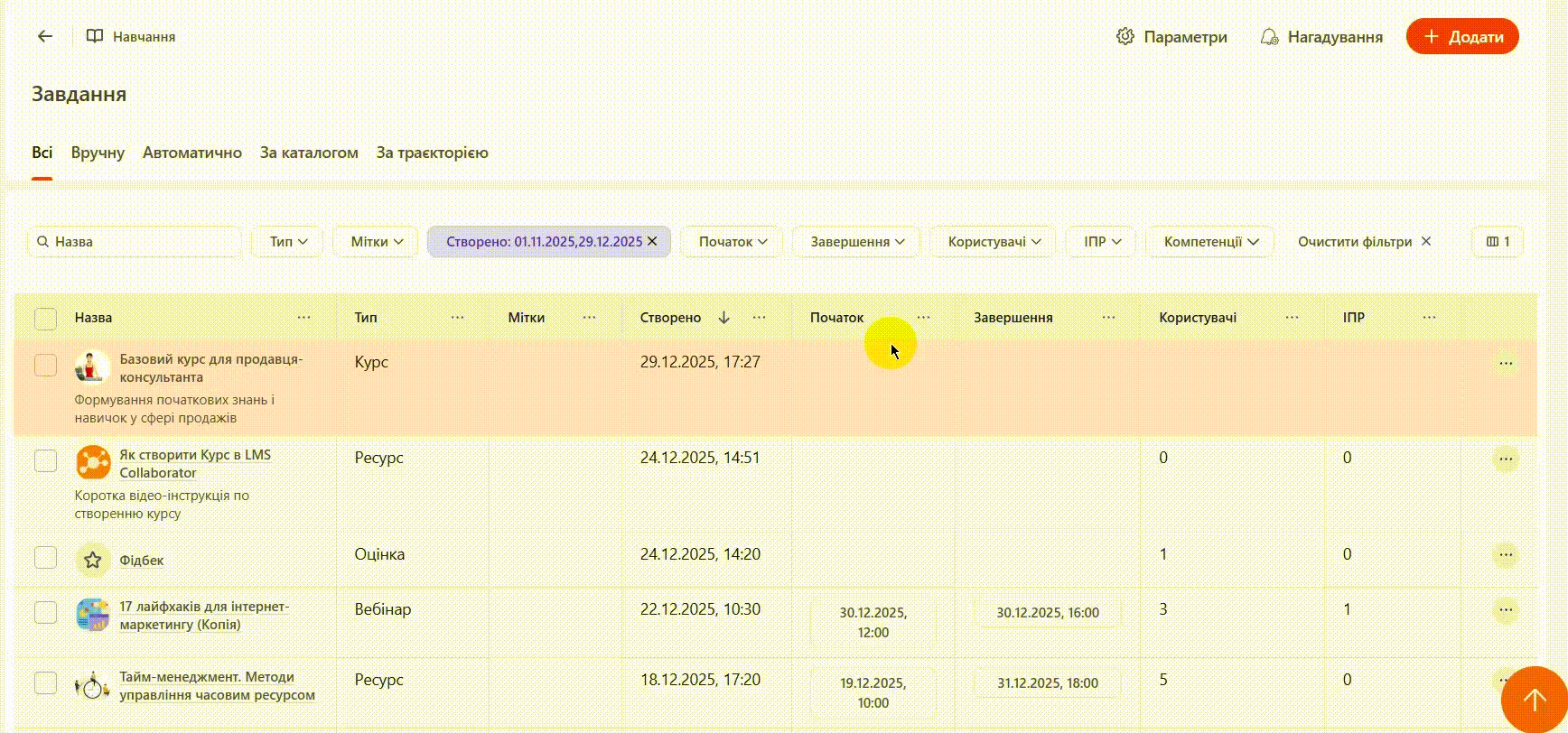 (3) - Тип - відображається формат завдання. Це може бути: курс, ресурс, практикум, очне заняття, тест, комплексний тест, опитування, оцінка, чек-лист, вебінар;