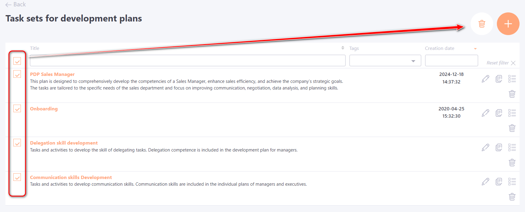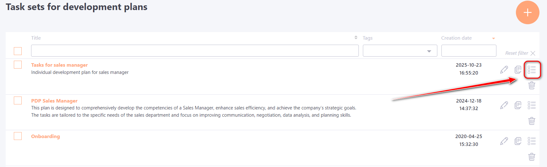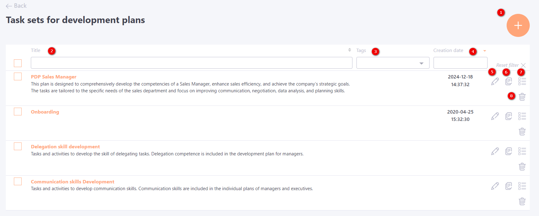 The Task sets for development plans page displays a list of previously created tasks, and the following buttons are available: