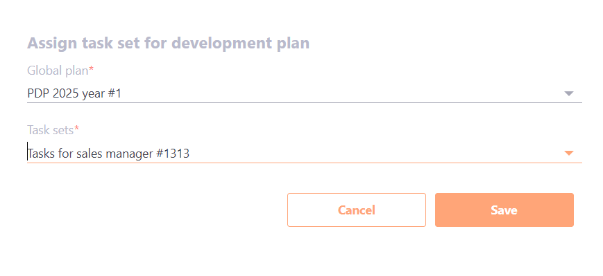 A user can independently assign a Task Set to their Development Plan. To enable this, the Administrator must activate the corresponding setting in the Tasks policy and enable the "Allow users to assign themselves task sets in development plans"option in at least one Task Set.