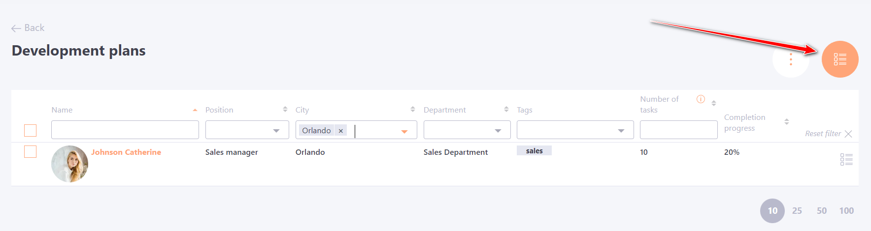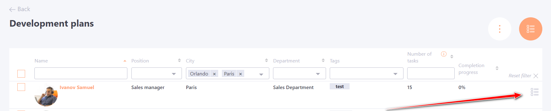 Button to go to the list of sets from the Development Plans page (menu Development - Development Plans).