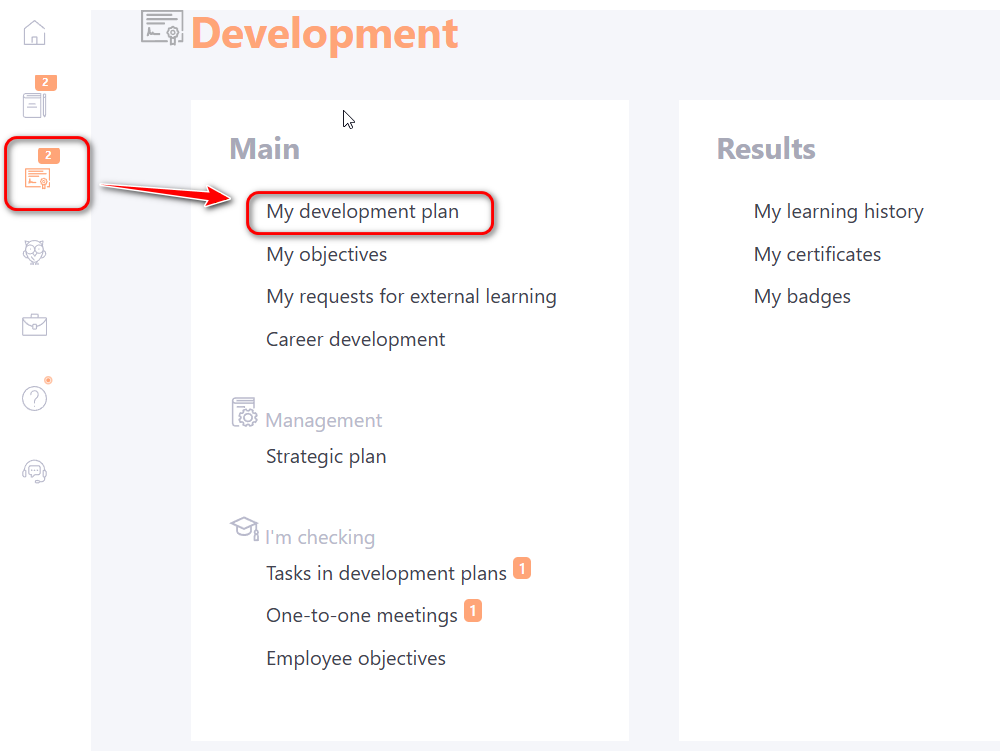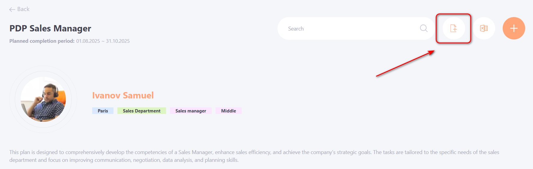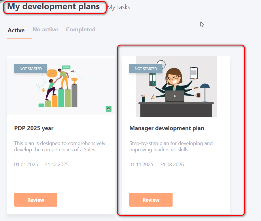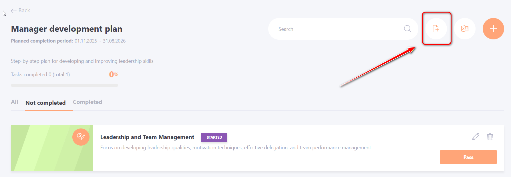Among the assigned development plans, select the one to which the tasks need to be added. For example, Manager development plan.