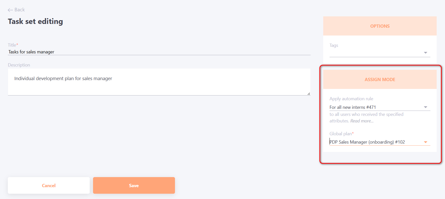 A Task Set can also be assigned to a Global development plans using an Automation rules when creating or editing the Task Set: