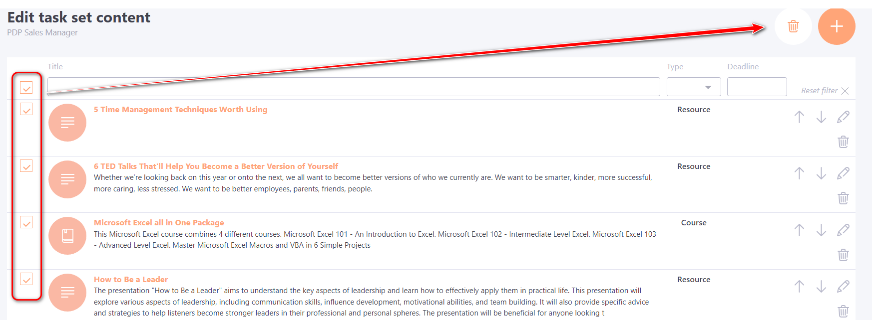 Go to the Edit task set content page. A table will open showing the tasks that are already included in the set (created earlier)
