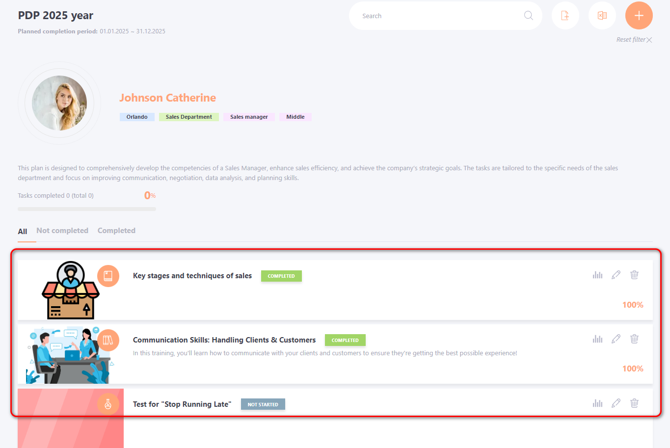 The tasks from the selected Task Set will be added to the user’s Development Plan. The user will also be able to edit and delete the Personal tasks assigned from the Task Set.