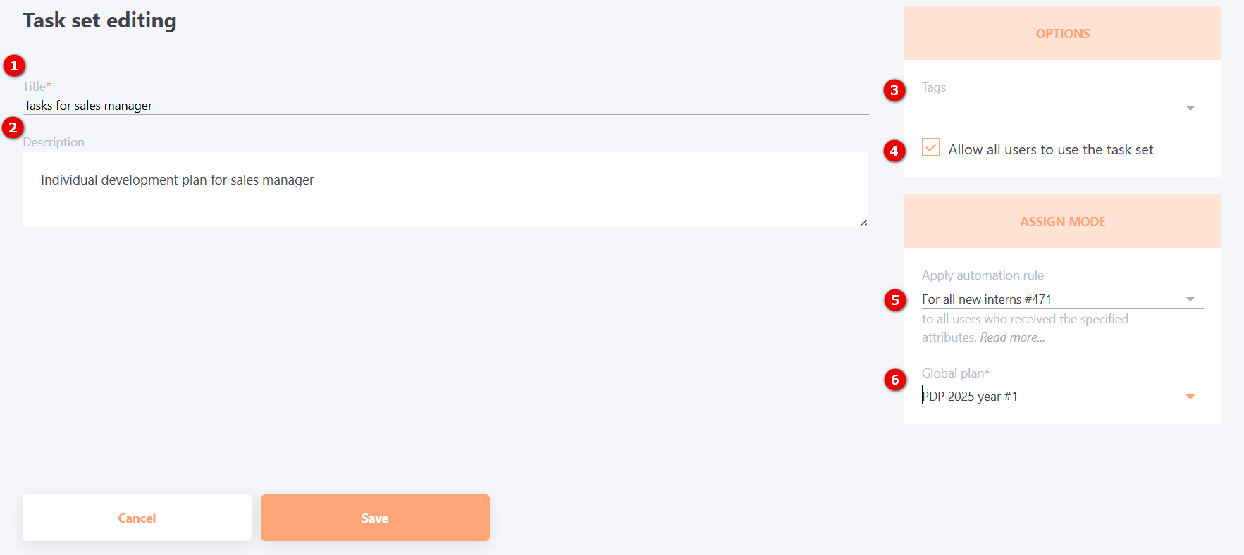 (5) - Apply automation rule - if necessary, configure automation rules in Assign mode. Then you must specify the Global development plans (6) to which this set will belong.