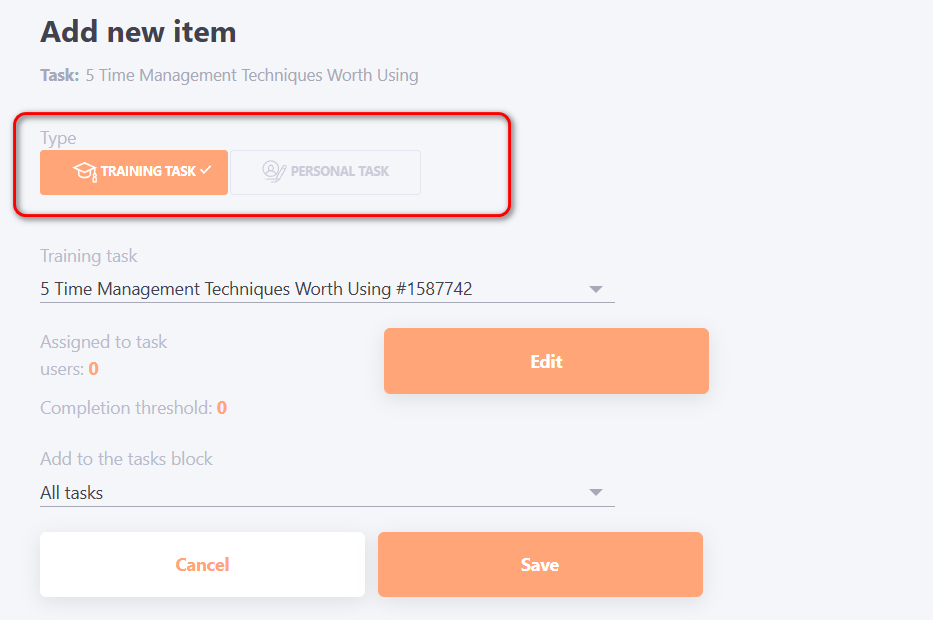 and on the "Add new item" page, create the necessary Training or Personal task (more details: Adding training tasks for Personal plans, Adding personal tasks for Personal plans)