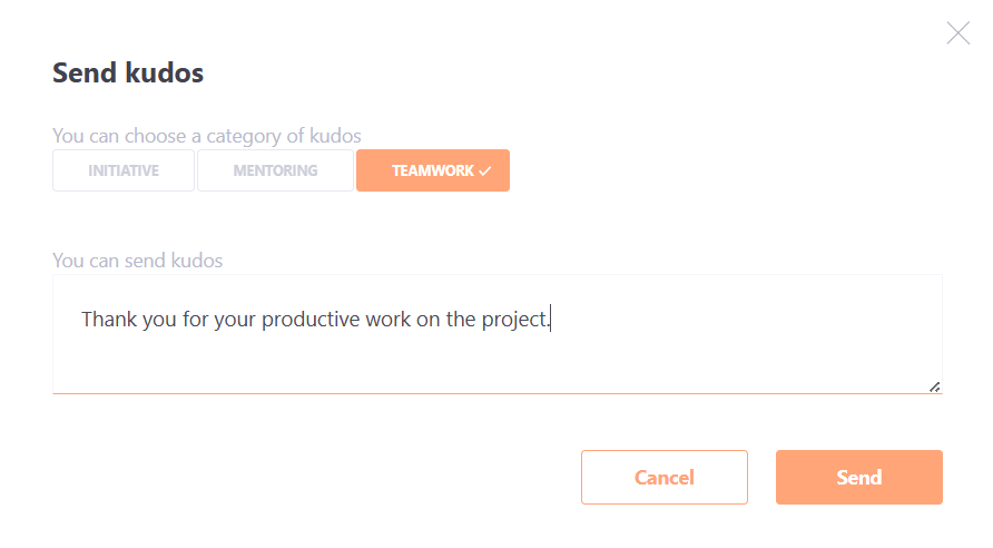 When clicking the icon, a modal window opens where you need to enter the kudos text, select a category (if required), and click the Send button: