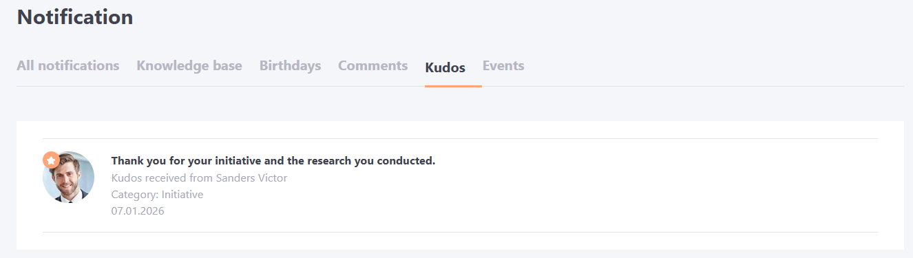 When clicking on the message text or the “All notifications” button, the Notifications page opens. On the Kudos tab, you can view all received kudos, including the kudos text, the sender’s full name, the kudos category, and the date it was sent.