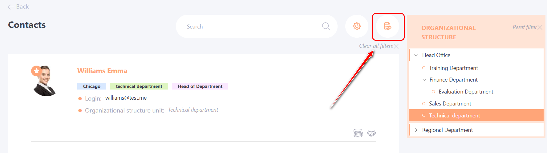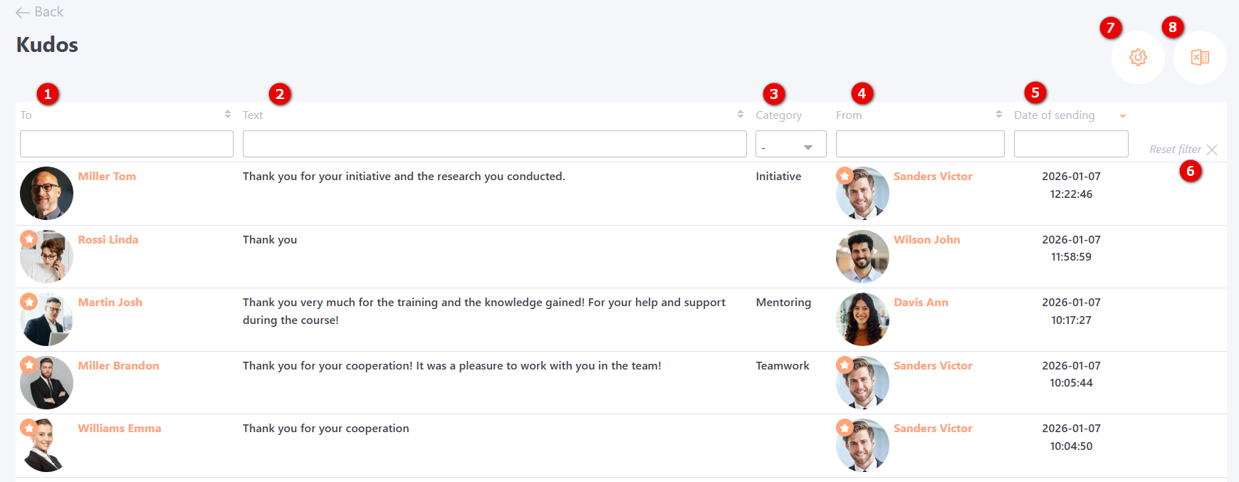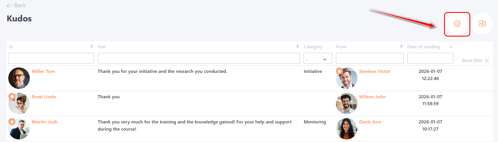 For the administrator (the role with the "manage kudos" permission), the Contacts page displays an icon to go to the table with all sent kudos over the entire time.