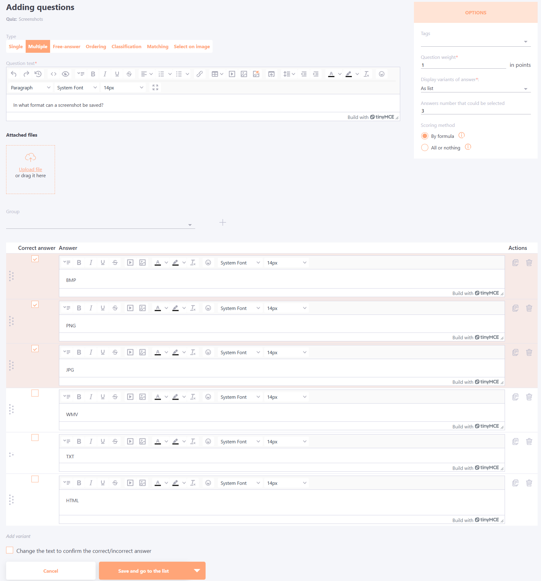 When using the Formula scoring method, points may be awarded in part, depending on the number of correctly selected options. When choosing the All or Nothing method - the user receives the maximum score specified in the question parameter Question Weight, only if all correct answer options and no incorrect ones are selected.