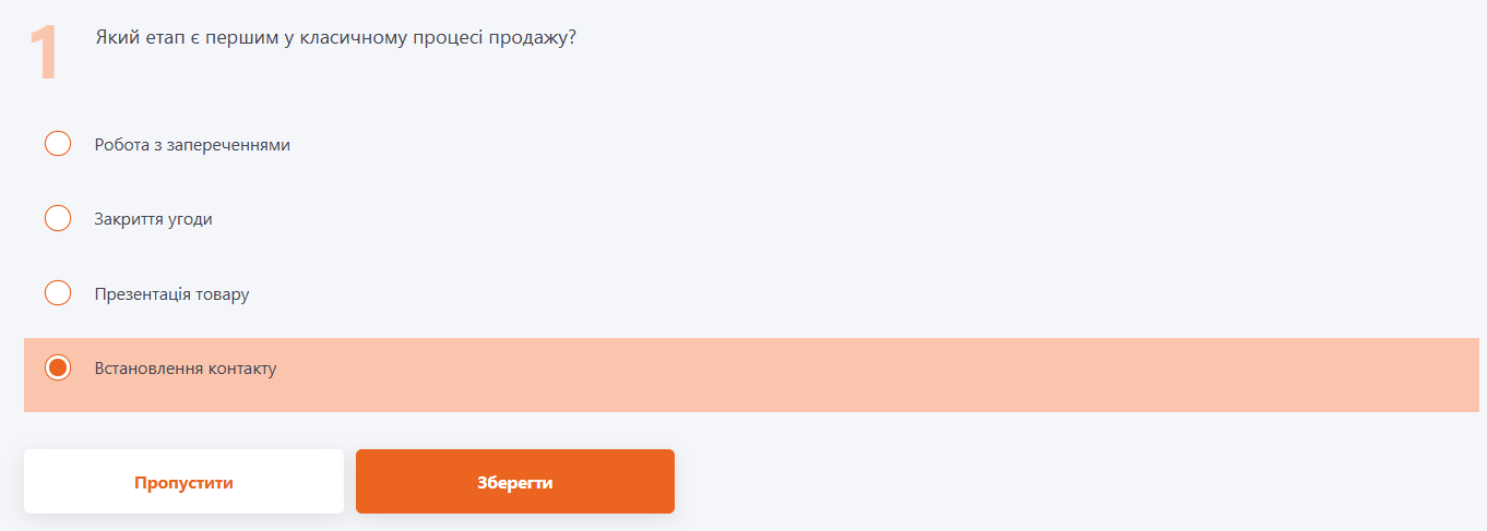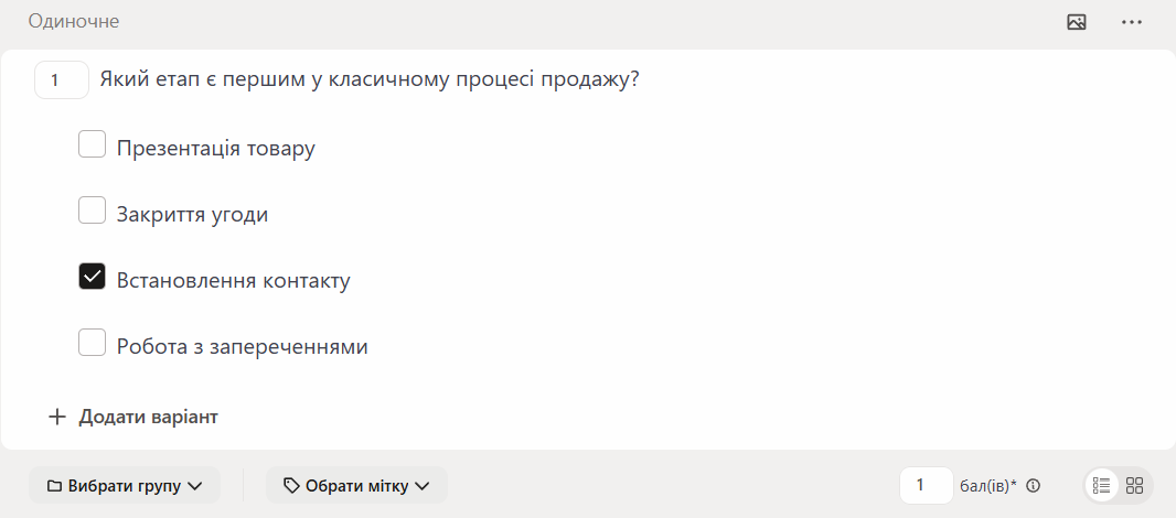 Приклад проходження питання з типом «Одиночна відповідь»: