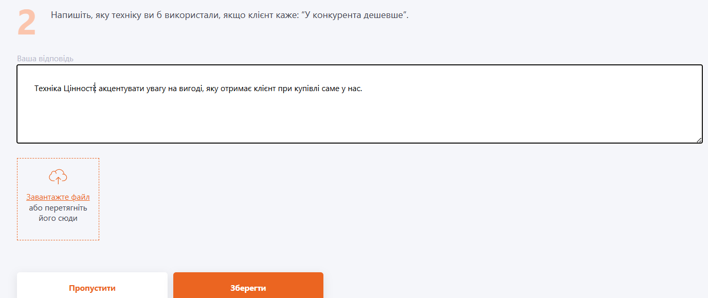 Тип питання «Вільна відповідь» передбачає самостійне написання відповіді користувачем. Також користувач має можливість прикріпити до відповіді файл. Для цього на сторінці створення/редагування питання потрібно включити опцію "Дозволити прикріпляти файли до відповіді".