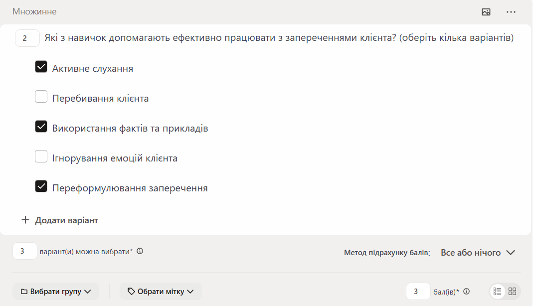 (3) - В варіантах відповіді зазначити правильний варіант. За потреби, можна вказати кілька правильних відповідей. Тоді результат проходження питання буде розраховуватись за формулою, про що детальніше в статті Розрахунок результатів для тестів.