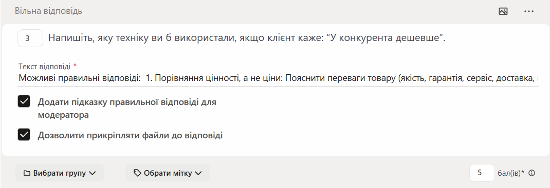 Якщо задати в налаштуваннях ваги питання більше 1 балу (наприклад, 5), під час перевірки потрібно буде оцінити відповідь певною кількістю балів із зазначеного діапазону (наприклад, від 0 до 5).