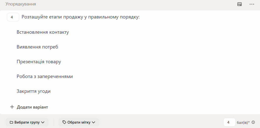 При проходженні Користувач повинен розставити варіанти відповіді в тому порядку, в якому вони розташовані при створенні питання.