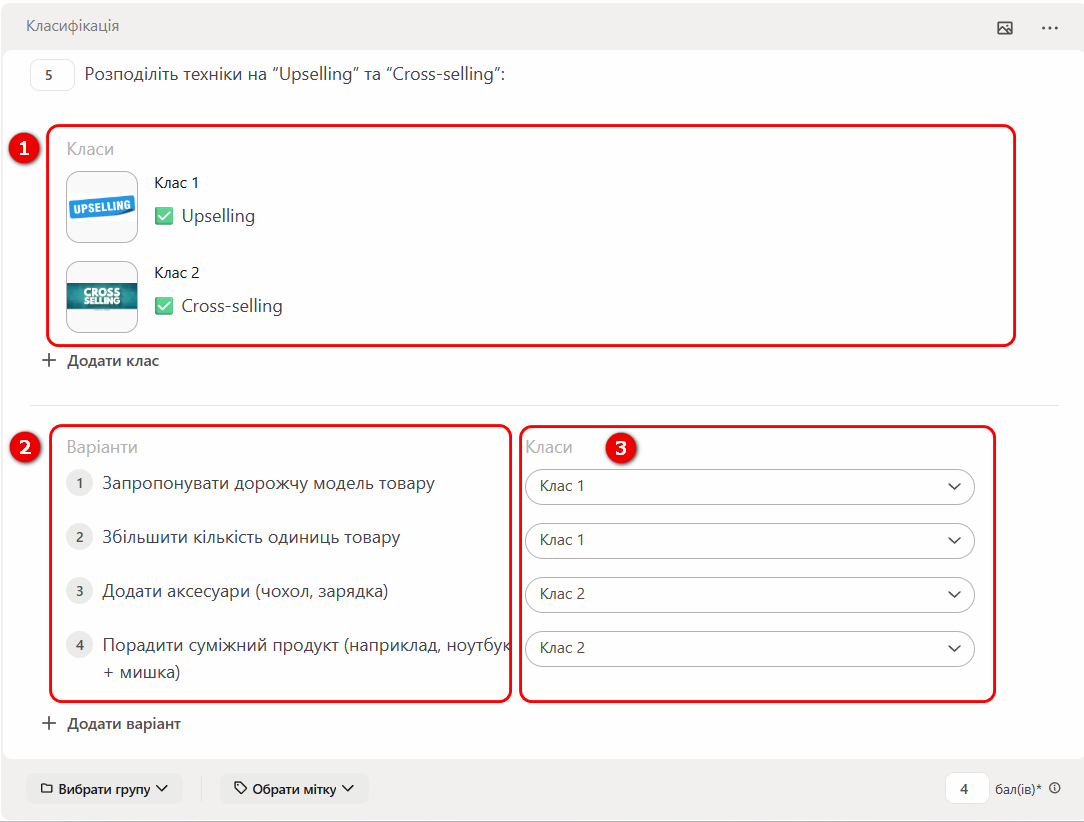 При створені даного типу питання спочатку потрібно ввести варіанти класів (1), далі варіанти відповідей (2) і з випадаючого списку обрати до якого класу вони відносяться (3).