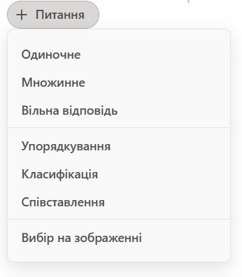 В тесті можуть використовуватись 7 типів питань: