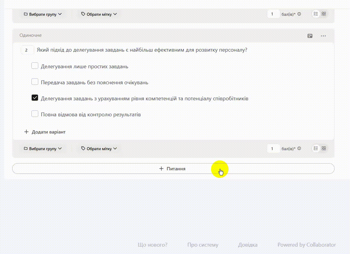 Приклад створення питання з типом «Одиночне»: