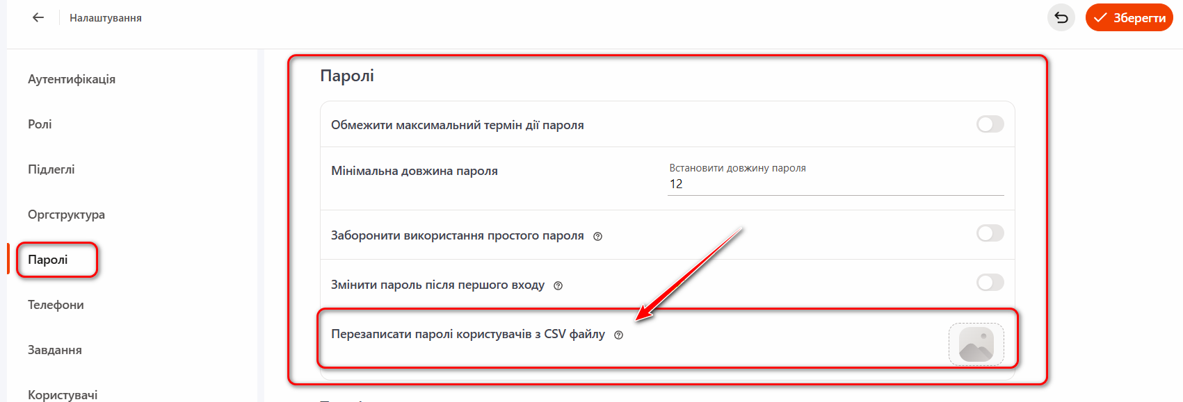 Оновити паролі Користувачів із файлу можна на сторінці Політика паролів: