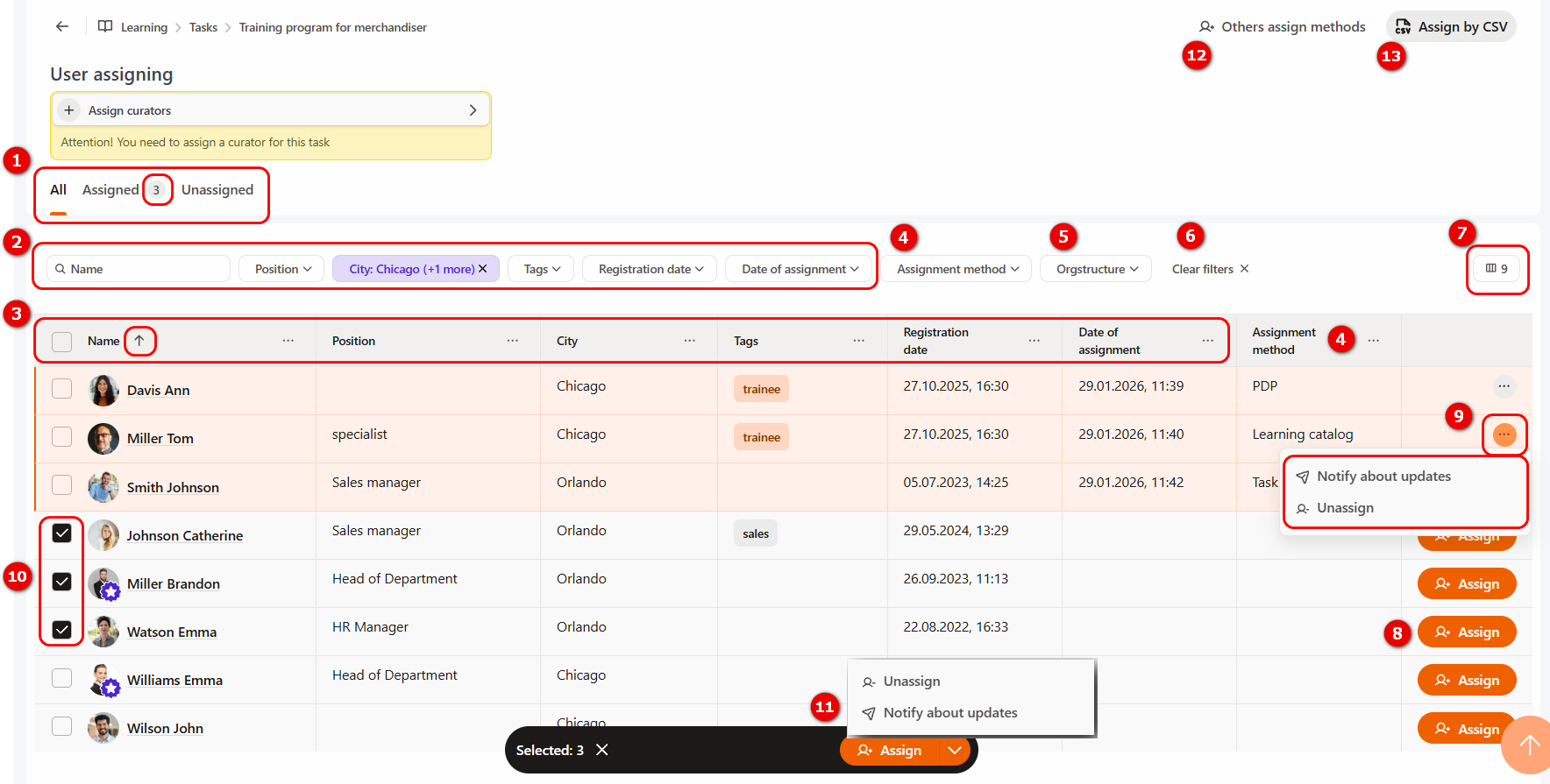 - Group assignment - to assign a task to multiple users at once, select their checkboxes (10) on the left. A modal window (11) with available bulk actions will appear at the bottom of the page. By default, the Assign button is shown; clicking the arrow also provides the options Unassign from task and Notify about updates. If the checkboxes are deselected, the bulk actions modal window is automatically hidden.