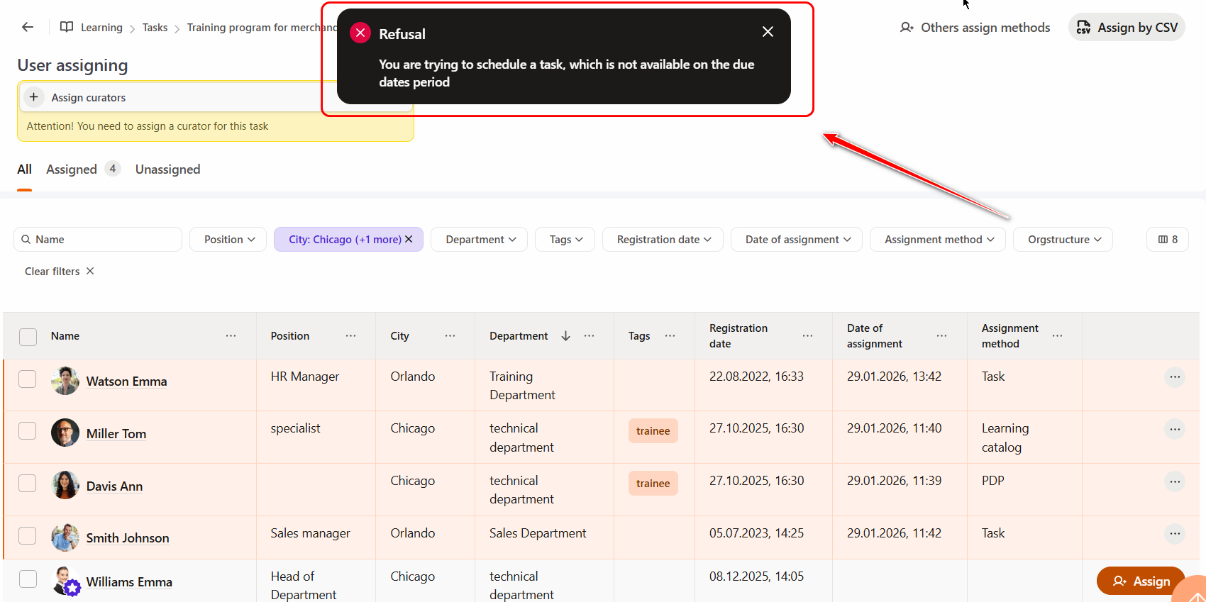 For tasks with limited completion deadlines, if the "Do not block access after expiration date" setting is disabled, assigning users to overdue tasks is not possible. In this case, the system will display a corresponding notification.