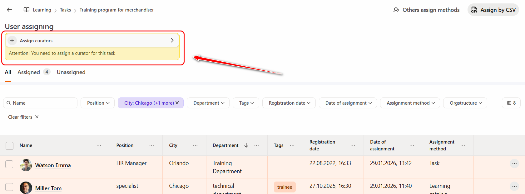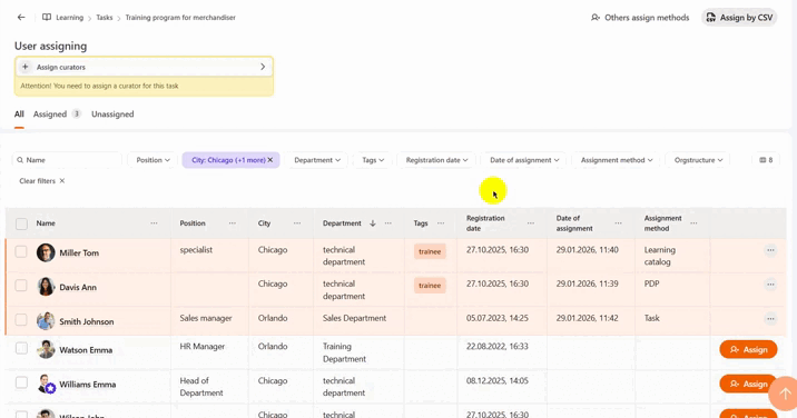 To quickly assign a group of users who do not have common attributes, you can do the assignment using a csv file.