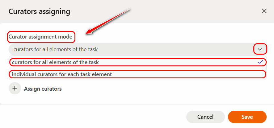 If a webinar is included in the Program task, then the "Curator assignment mode" can only be changed from "Curators for all elements of the task" to "Individual curators for each task element", and then the function of changing the curator assignment mode is blocked. For such a Program, only one curator can be assigned to each task element.