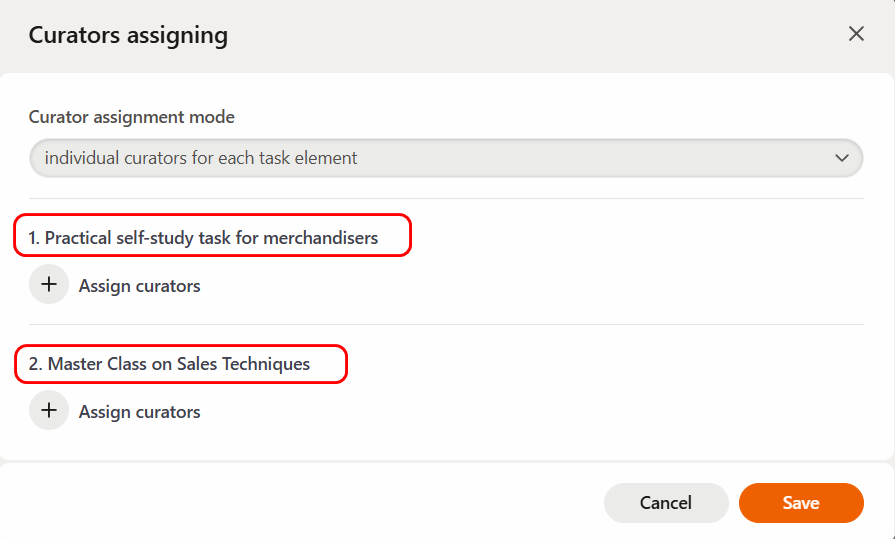 If a Course or Training Program contains several tasks that require curators, you can select a separate curator for each of these tasks.