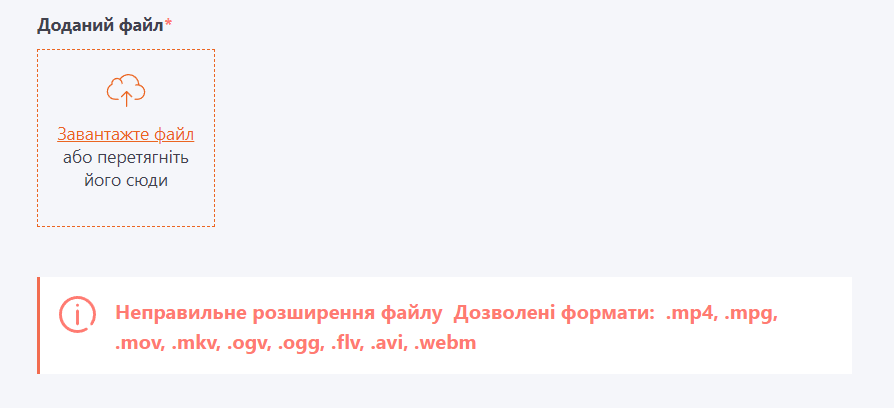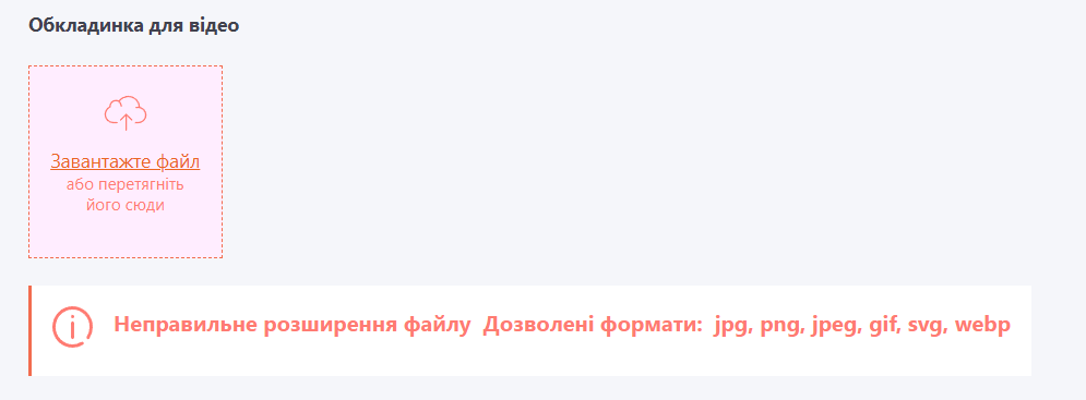 - Файл обкладинки для відео може бути у таких форматах: jpg, png, jpeg, gif, svg, webp. Якщо файл має інше розширення, система відобразить повідомлення про помилку.