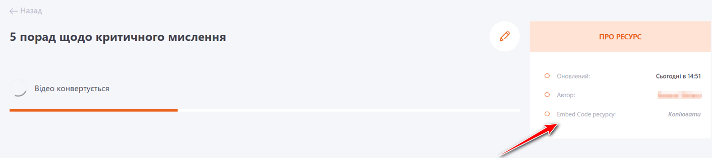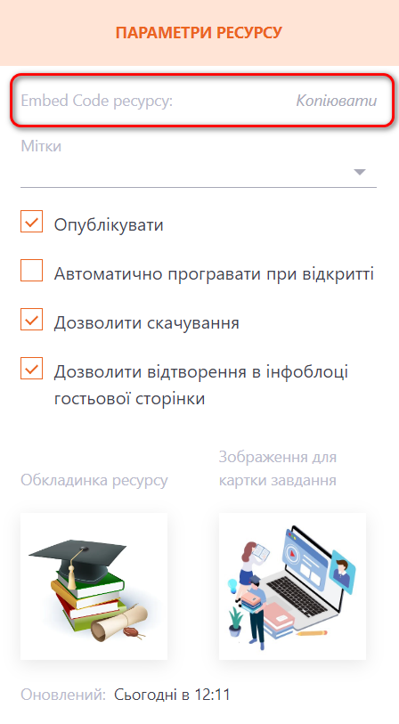 Після збереження відео, при його повторному відкритті чи редагуванні відео-ресурсу, в блоці Про ресурс та блоці Параметри ресурсу з'являється додаткова функція - Embed Code ресурсу - за допомогою якоі можна скопіювати та використовувати для вставки дане відео в ресурс-сторінку. Детальніше тут - Вставка ресурсу за кодом.
