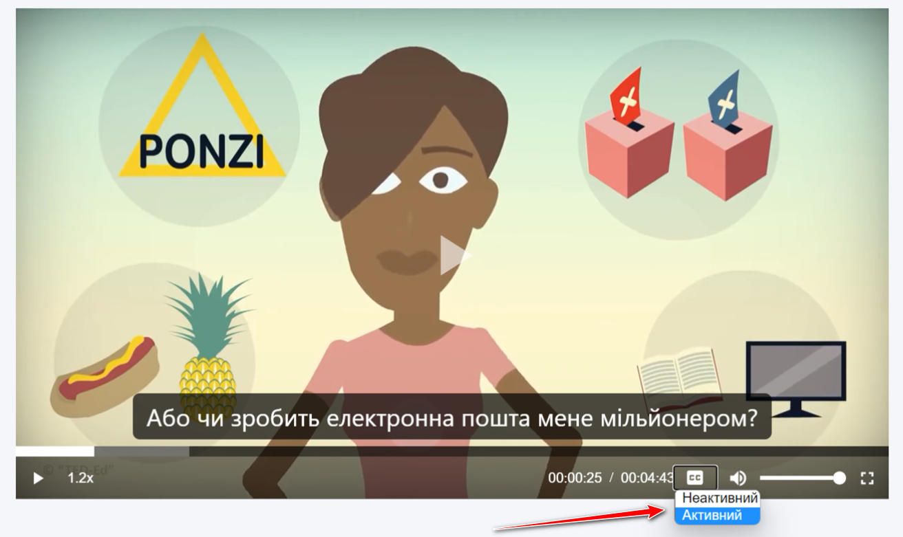 Якщо для відео завантажено субтитри, їх можна зробити активними або неактивними.