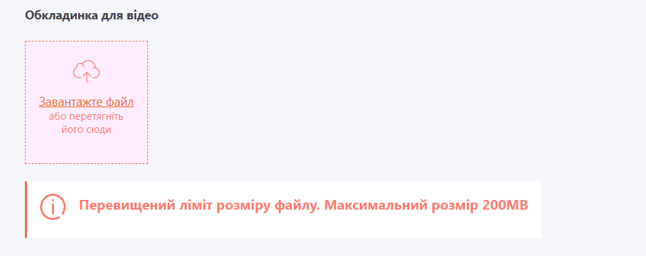 - Максимальний розмір файлу обкладинки для відео становить 200 МБ. Якщо файл більший, система відобразить повідомлення про помилку.