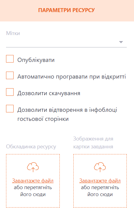 - Обкладинка ресурсу та Зображення для картки завдання - картинки, які виводяться на картці завдання у каталозі та "моїх завданнях", а також на картці ресурсу в Базі Знань.