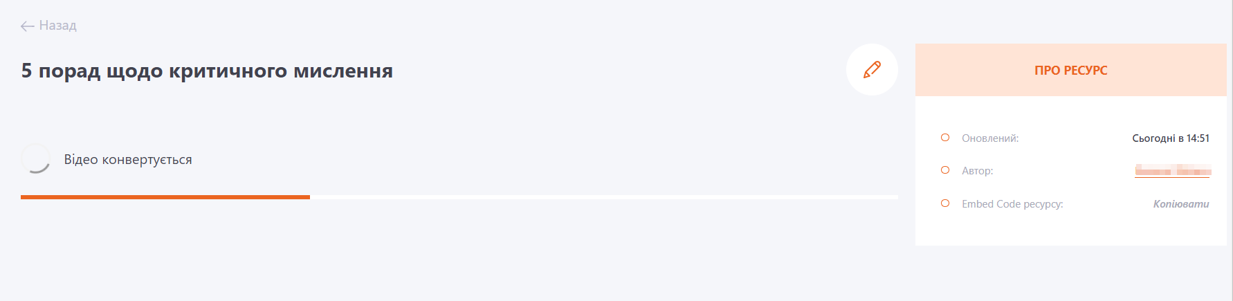 Після збереження та публікації ресурсу-відео всі типи відеофайлів автоматично конвертуються у формат mp4. Конвертація відбувається один раз після першого збереження (це може тривати кілька хвилин, залежно від розміру відео).