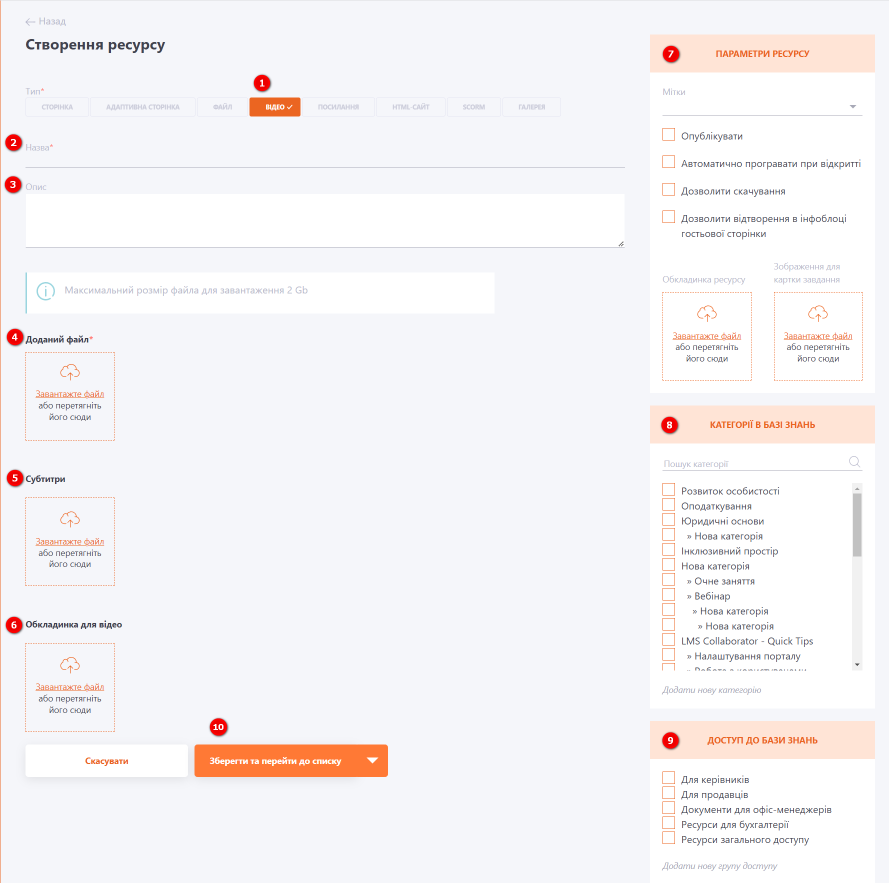Для створення ресурсу-відео необхідно вибрати відповідний тип ресурсу - Відео (1), вказати Назву (2) (обов'язкове поле) та Опис (3) (необов'язкове поле, виводиться в таблиці з ресурсами, у ньому здійснюється пошук паралельно з назвою).